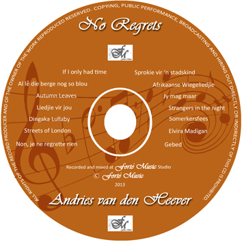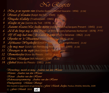 We are proud to announce the release of Andries's new CD - an easy listening compilation of instrumental and vocal tracks. Click on any of the titles in the last column below to listen to a short clip of each track. Happy listening!